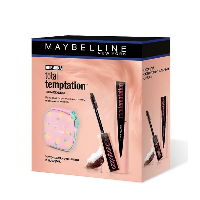 Всем девушкам нужна тушь для ресниц, особенно объемная. Этот продукт всегда актуален, потому что его советуют менять раз в месяц. В формуле классической черной Total Temptation есть масло кокоса — так приятно пахнет. А бонусом в наборе идет чехол для наушников — точно не лишний аксессуар!