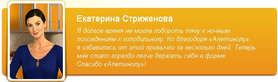 Но, к счастью, существуют и куда более «гуманные» способы похудения. Современная фармакология дает возможность избавиться от лишнего веса без особых усилий и изменений в привычном образе жизни. Например, есть препараты, которые борются с ожирением посредством блокирования чувства голода. К ним относится АПЕТИНОЛ. Употребление этой биологически активной пищевой добавки позволяет человеку уменьшить свой дневной рацион на 30-40 %. И все это — без каких-либо негативных последствий для организма.