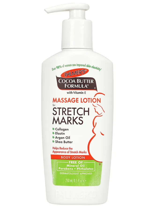 Еще одно эффективное средство от растяжек во время беременности – недорогой лосьон Palmer's Cocoa Butter Formula позволяет поддерживать кожу увлажненной. Он снимает зуд и раздражение. Масло ши и аргановое обеспечивают проникновение витамина Е в более глубокие слои эпидермиса, повышая эластичность тканей. Учитывая, что лосьон предназначен для массажа, чтобы впитаться, ему понадобится не менее пяти минут.