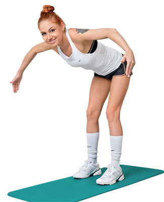 ИП: стоя в наклоне, ноги слегка согнуты в коленях, взгляд – вперед, сзади мышцы шеи вытянуты, плечи и лопатки направлены вниз.