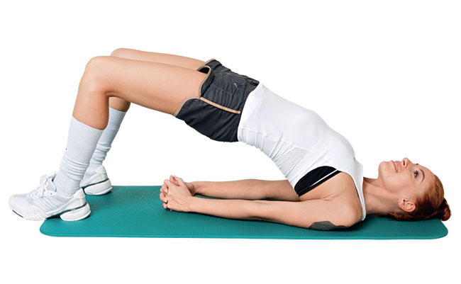 На вдохе медленно (!) подними таз, затем спину – позвонок за позвонком. В верхней точке зафиксируй положение на несколько секунд. На выдохе плавно опусти спину и ягодицы. Пресс и мышцы ягодиц во время упражнения работают постоянно!
