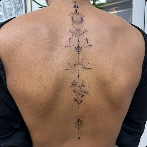 Перед тобой еще один тату-тренд, который совершит свой грандиозный камбэк в 2025 году. Минималистичные узоры вдоль линии позвоночника подчеркивают естественные контуры спины и смотрятся очень секси.