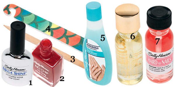 1. Верхнее покрытие Mega Shine Top Coat; 2 НОВИНКА! Лак No Chip 10 Days Nail Color №95; 3 Деревянная палочка; 4 Пилочка Hook Hanging Elegant Emery; 5 Увлажняющая жидкость для снятия лака Moisturizing For Dry, Brittle Nails; 6 Масло для ногтей и кутикулы Vitamin E; 7 Средство для укрепления ногтей Hard As Nails |