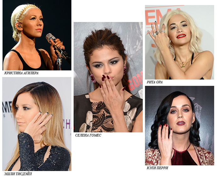 Бордовый и красный — это всеми любимая классика, особенно, когда дело касается маникюра. Этой зимой это может быть насыщенный глянцевый оттенок, как у Кэти Перри, или матовые длинные ногти, как у Селены Гомес.