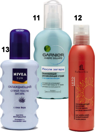 | 5. Шампунь-гель для душа после загара Sun от Nature’s препятствует шелушению кожи, не смывает загар, 579 руб. 6. Шампунь «Солнечный уход» от Karité очищает и восстанавливает корни волос после пребывания на солнце, 299 руб. | 11. Освежающий увлажняющий спрей после загара от Garnier Ambre Solaire освежает разгоряченную после солнца кожу,289 руб. 12. Охлаждающее молочко после загара от Faberlic успокаивает, уменьшает покраснения, дарит ощущение комфорта, 249 руб. 13. Охлаждающий спрей после загара от Nivea Sun снимает ощущение жжения и восстанавливает уровень увлажненности кожи, 222 руб. |