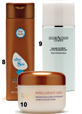| 1. Увлажняющая маска после загара Hydra Intense от Lancôme помогает коже удерживать влагу, 1520 руб. 2. Маска для лица после загара от Cettua увлажняет и восстанавливает кожу, 175 руб. 3. Суперзащитный увлажняющий крем тройного действия Superdefense от Clinique нейтрализует вредное воздействие солнечных лучей, вызывающих старение кожи, 1582 руб. 4. Интенсивно питающий крем для очень сухой кожи Nutrisource от Biotherm восстанавливает ее защитный слой, моментально питает,1600 руб. | 8. Питательная эмульсия для тела My Sun от After Sun, 650 руб. 9. Ультраувлажняющий бальзам для тела HidrAction Corps от Dior, 2600 руб. 10. Крем для тела Intelligence Soleil от Dr. Pierre Ricaud для зон декольте, шеи, рук восстанавливает кожу после солнца, 995 руб. |