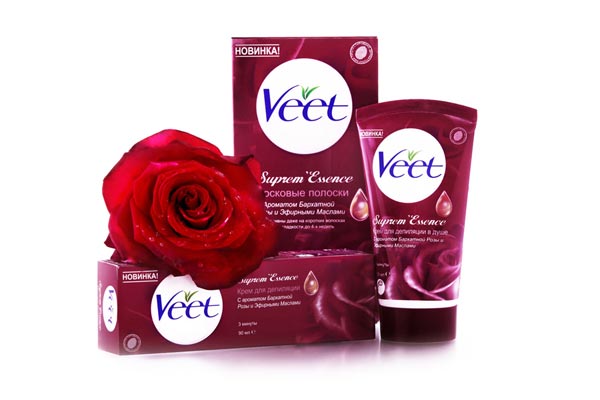 Попробуйте новинку — Veet Suprem'Essence с натуральными эфирными маслами и ароматом бархатной розы. В новой линии ты найдешь крем для депиляции (в том числе в душе) и восковые полоски.