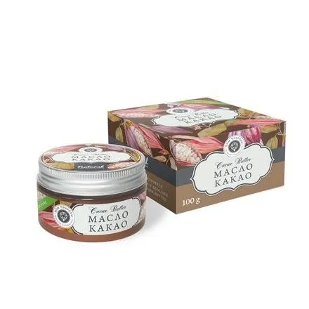 Препарат комплексного действия. Рекомендуется для ухода за волосами, кожей рук, зоной декольте и лицом. Масло упаковано в стильную картонную коробку. Внутри круглая стеклянная банка с откручивающейся крышкой. Есть рекомендации от производителя о том, как использовать масло какао для ухода.