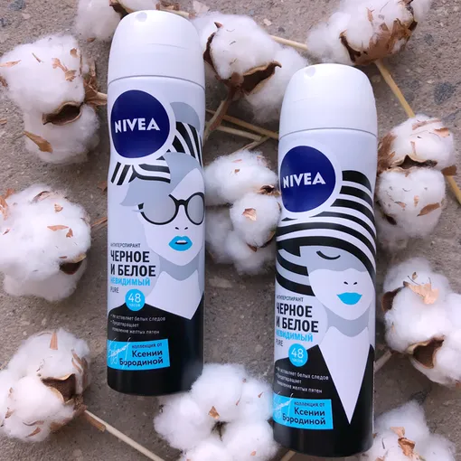 Компания Nivea продолжает свое сотрудничество с телеведущей Ксенией Бородиной, в результате которого появилась новая коллекция антиперспирантов в стильном флаконе «Черное и белое. Невидимый Pure», которые защищают от мокрых подмышек на протяжении 48 часов, а также не оставляют белых следов на черных вещах и желтых пятен на белой одежде после использования.