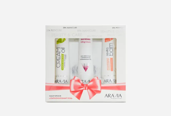 А этот бьюти-сет заинтриговал своей универсальностью и ультрапитательными составами средств. В набор входят три крема, которые впишутся в бьюти-рутину любой из нас. Крем для рук насыщен маслами макадамии и карите, формула восстанавливающего крема для ног богата витаминами, а в составе крема для лица значатся аминокислоты — для лифтинга и борьбы с пигментацией.
