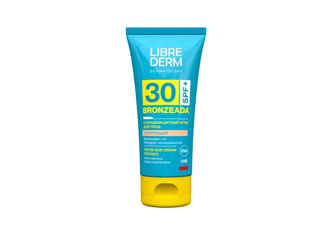 Если дуэт солнцезащитного средства и тонального флюида тебе кажется довольно плотным, можно сделать ставку на продукты от солнца с тонирующим эффектом — вроде крема Bronzeada от Librederm, с оптимальным уровнем защиты SPF 30 и выравнивающим действием.