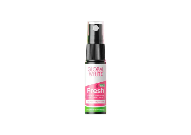 Этот мини-флакон никогда не будет лишним в сумочке! Помимо сочетания экстрактов ментола и арбуза, отвечающих за свежесть дыхания, формула спрея Global White обогащена ксилитолом, подавляющим развитие бактерий, которые вызывают кариес, и бетаином, смягчающим состояние слизистой оболочки рта. Кстати, одна бутылочка спрея заменяет несколько пачек жевательной резинки, а использовать это средство быстрее и удобнее.