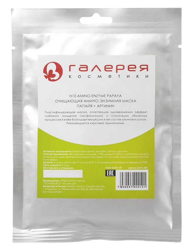 Папаин, вещество, которое содержится в одноименном фрукте, глубоко очищает кожу, удаляя ороговевшие частицы. Аминокислота аргинин стимулирует рост клеток, запускает процессы регенерации. Основой средства является диатомовая земля, известная своими полезными свойствами. Порошок пластифицирующей маски разводят водой в нужных пропорциях и шпателем наносят на лицо и шею до полного застывания состава.