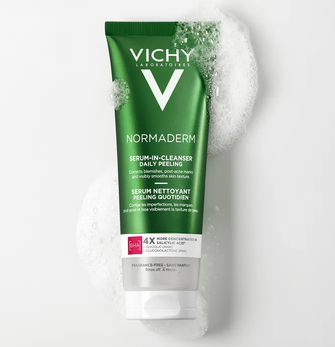 Новинка в гамме Normaderm от Vichy поможет уменьшить высыпания, как на лице, так и на теле. Очищающее средство с эффектом пилинга содержит концентрацию активов, как в сыворотке для интенсивного ухода: при этом его можно использовать вместо средства для умывания или геля для душа. Кислоты разных групп (салициловая, гликолевая, глюконолактон) мягко, но эффективно отшелушивают кожу и ускоряют обновление, заодно снижая видимость пигментации и следов постакне.