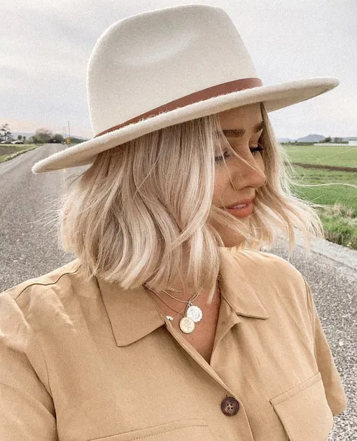 Если у тебя короткая стрижка, панама — твой главный союзник. Вместо борьбы за объем подчеркни текстуру. Нанеси немного стайлинга, придавая волосам направление, и пусть они чуть небрежно выбиваются из-под полей. Каре, особенно с легкой филировкой, придает образу ритм и характер. Подобная укладка делает шляпу или панаму частью образа, а не компромиссом. Главное не приглаживать волосы: легкая небрежность и есть твоя точка притяжения.