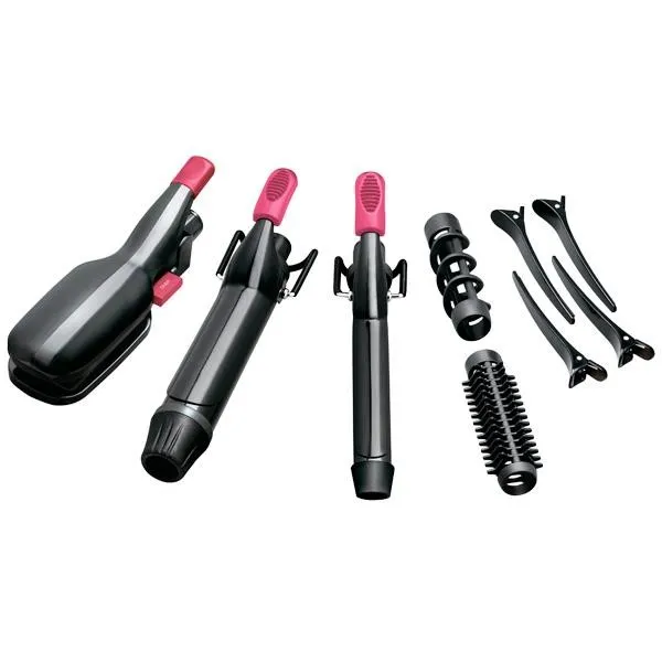 Устройство с металлическим покрытием рабочей поверхности, которое бережно относится к волосам. В нем семь разнообразных насадок – от массажной до гофре, использование которых позволяет либо выпрямить, либо завить волосы и не прибегать к использованию фена, то есть не подвергать волосы дополнительному агрессивному воздействию горячего воздуха. Насадки легко менять. Для хранения устройства и насадок предусмотрена специальная сумочка.