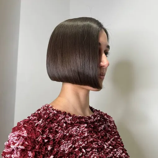 Что касается типа волос, геометрическое каре особенно хорошо раскрывается на прямых или слегка волнистых — именно такая текстура позволяет линии стрижки выглядеть максимально четко. Лучше всего форма держится на тонких или средних по плотности волосах: благодаря точной геометрии они выглядят гуще, а сама стрижка — структурнее и объемнее.