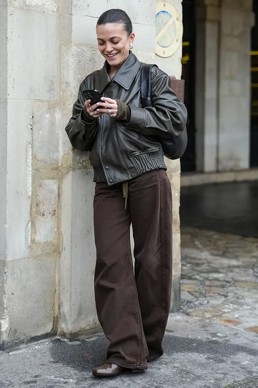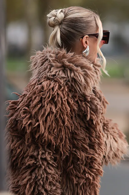 Объемная верхняя одежда лучше смотрится с аккуратной укладкой. Гладкий пучок уравновешивает силуэт и делает образ элегантным.