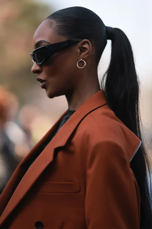 Высокий хвост повторяет четкую линию плеч пиджака. Такая комбинация делает силуэт четким и современным.