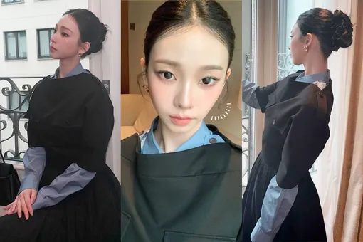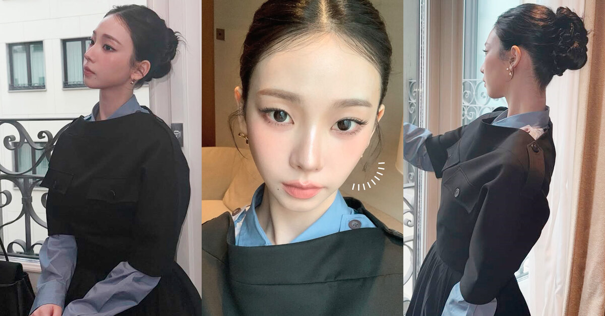 Карина из aespa подчеркивает свои выразительные черты аккуратным пучком, который открывает линию шеи. Боковые пряди гладко зачесаны назад и убраны за уши, благодаря чему черты лица становятся еще более выразительными. Идеально выровненная линия роста волос и умелая укладка превращают девушку в настоящую принцессу.