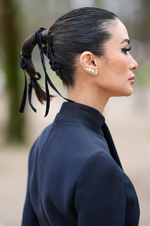 Тренд на clean girl aesthetic по-прежнему в топе — и не зря: он прост в исполнении и всегда смотрится безупречно. Чтобы повторить этот аккуратный короткий хвост, сначала выпрями волосы, а затем собери их на средней высоте, используя щетку с натуральной щетиной для идеально гладкой поверхности. Закрепи результат средне- или сильной фиксацией, чтобы пригладить все выбившиеся волоски.