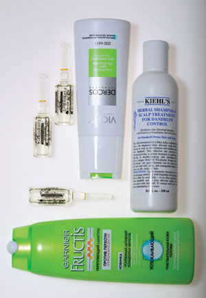 | Шампунь «Ослепительный бриллиант» от Nivea Hair Care; шампунь+интенсивный уход Gliss Kur «Жидкий шелк» от Schwarzkopf; Radiant Shine Mask от L'Occitane; восстанавливающая маска «Пшеничные протеины и женьшень от Oriflame; кондиционер "Защита и блеск" от Timotei | Ампулы Biokera Locion Especifica Caspa от Salerm; Dercos Shompooing Anti-Pelliculaire от Vichi;