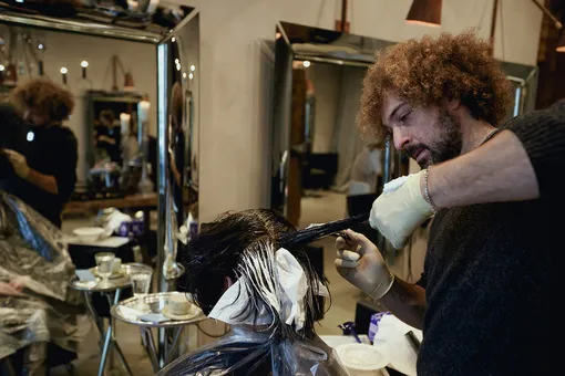 Даниэле тонирует корни волос, чтобы выровнять цвет.