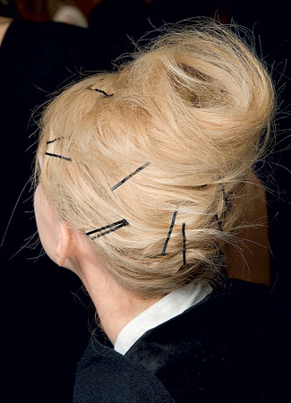 ![]() | Видимые невидимки Это современная интерпретация всем известной «ракушки», навеянная Древним Египтом и новой коллекцией Вивьен Вествуд. Прелесть – в контрасте между текстурой и цветом волос и невидимок. Как сделать: Вымыть, отжать, нанести мусс для укладки по всей длине и тщательно высушить волосы. Сделать низкий боковой пробор, отделить вдоль него широкую прядь, разгладить ее утюжком и обернуть вокруг головы, закрепляя по пути невидимками контрастного цвета. Оставшиеся волосы спиралью уложить в пучок на макушке (можно слегка начесать у корней), зафиксировать невидимками, слегка растрепать кончики прядей там, где возможно, и сбрызнуть лаком для надежности. |