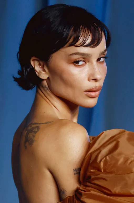 Зои Кравиц носила эту модную челку, когда это еще «не стало мейнстримом», — в 2022 году. В этом варианте стрижки челка начинается от середины лба и заканчивается чуть выше бровей. Она фронтальная, плотная, но с легкой текстурой у корней, чтобы гармонично сочетаться с короткой стрижкой вроде короткого боба.