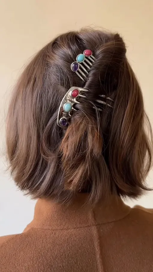 Этой весной в моду возвращаются аксессуары, которые выглядят как фамильная драгоценность. Приподними волосы у висков и воткни гребень в основу низкого пучка, чтобы добавить образу утонченного шарма в эстетике «тихой роскоши». Пробуй как варианты с инкрустацией, так и простые гребни из черепахового пластика в зависмости от своего лука.