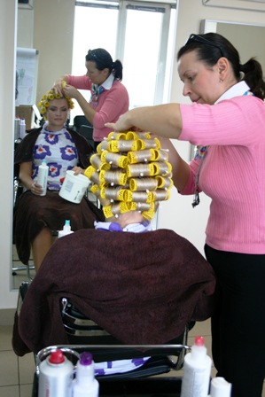 | Слегка подсушим волосы феном и накрутим на крупные бигуди.