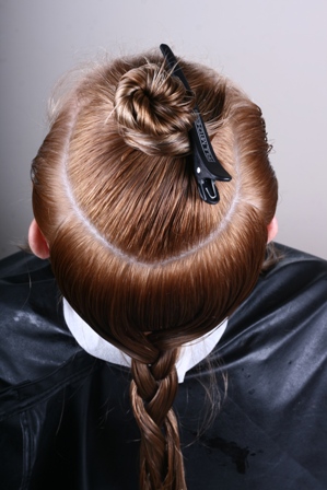 | У Тани средне-русые волосы, которые когда-то подвергались мелированию. Два месяца назад она осветлялась по всей длине, однако цвет остался неровным. Кроме того, Таня хотела бы сделать стильную стрижку, однако сильно убирать длину она не готова. | Первым делом осветляем корни. Для этого используется осветляющий крем High Lift, который не травмирует волосы и оптимально подходит для осветления натуральных светло- и средне-русых волос. |