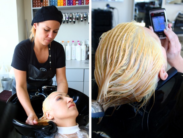 | Чтобы придать волосам чистый, глянцевый оттенок, мастер делает полироль для блондинок. Она шлифует волосы, а заодно оздоравливает. К Аниному типу внешности подходят теплые тона — например, медово-бежевый. В момент нанесения этот оттенок полироли выглядит ярко-рыжим, но бояться не нужно... | Через 10 минут полироль смывают, используя профессиональный Post-Color Shampoo. Продукт закрепляет искусственный пигмент внутри волоса и препятствует его преждевременному вымыванию. |