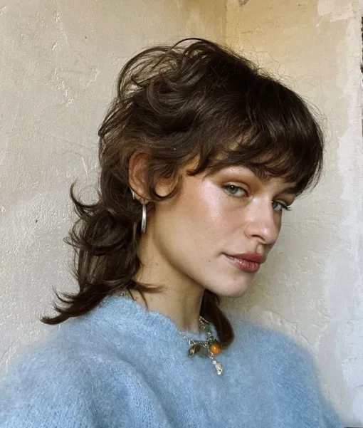 Мягкие слои, градуировка и тонкая прямая челка создают винтажный образ, как будто из старого европейского фильма. Такая прическа легко трансформируется — от строгого силуэта до мягкой растрепанности. Подходит тем, кто хочет придать волосам форму без сильного укорачивания.