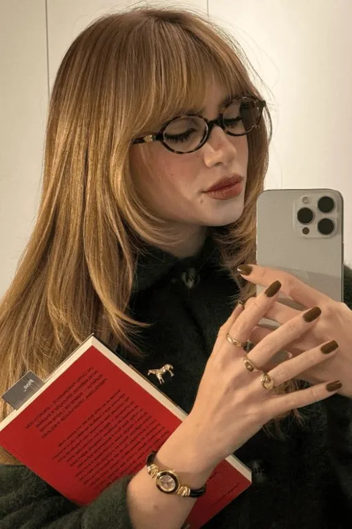 Образ интеллигентной француженки: идеален для тех, кто любит четкие формы и аккуратность. Прямая челка до бровей вносит строгость, а мягкие слои — объем. Отлично сочетается с очками и хорошо работает на прямых волосах.