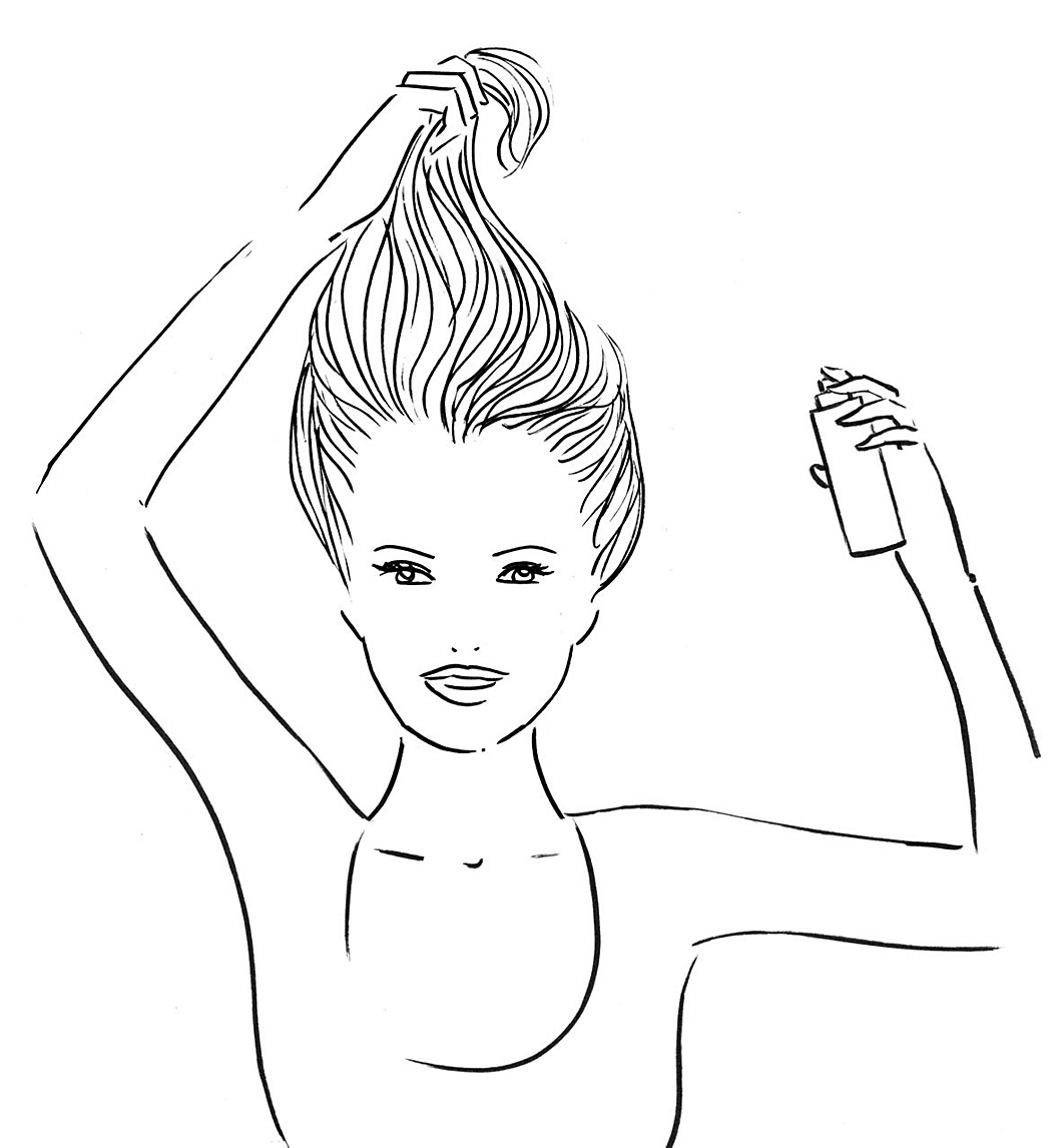 ![]() | 2. Выпрямись, собери все волосы наверх и, удерживая их, нанеси на корни немного лака. |
