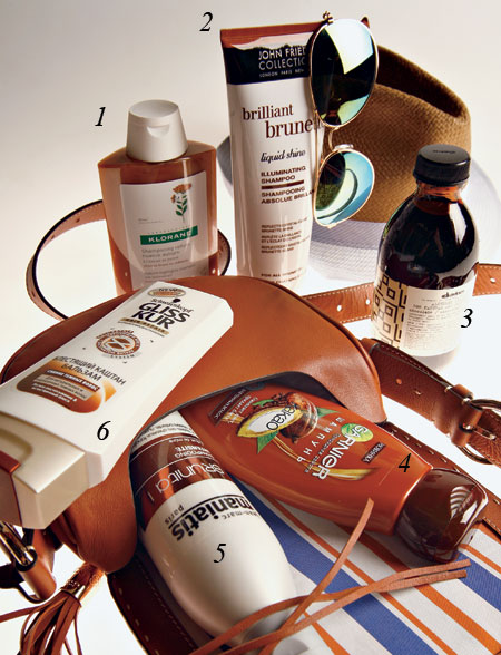 1. Шампунь Auburn Highlights Shampoo от Klorane. 2. Шампунь Brilliant Brunette Liquid Shine Illuminating Shampoo от John Frieda. 3. Шампунь Alchemic Chocolate от Davines. 4. Шампунь «Какао» от Garnier. 5. Шампунь Brunita от Jean-Marc Maniatis. 6. Бальзам Gliss Kur Hair Repair «Блестящий каштан» от Schwarzkopf