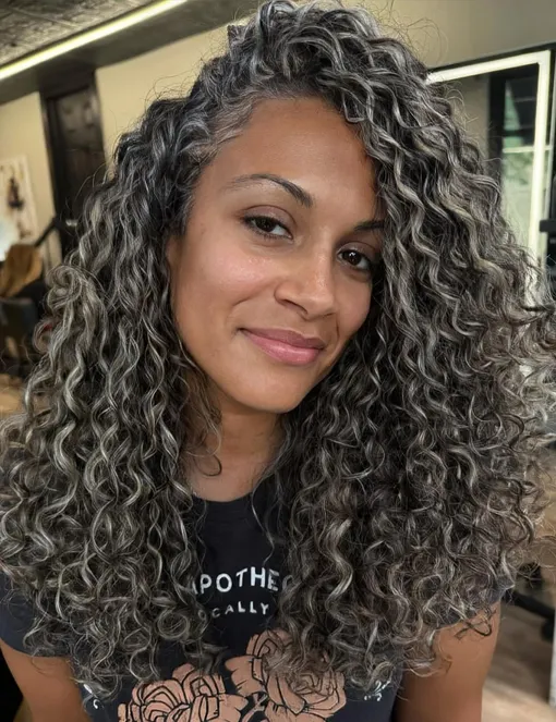 Главная фишка этого окрашивания в смешивании и тонировании седых волосков, грамотной комбинации светлых и темных участков, а также в выборе подходящего базового цвета. В результате получается насыщенный и объемный, а не однородный оттенок, который не только помогает смягчить седину, но и добавляет визуальной глубины и динамике всей прическе.