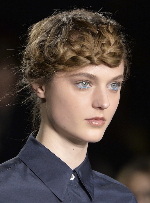 В образах с шоу Creatures of the Wind стилисты оплели полголовы широкой косой. Им удалось создать эффект косой челки — коса наполовину закрывает лоб. Чтобы повторить эту прическу, тебе потребуется сделать глубокий косой пробор, пригладить меньшую часть волос сбоку, а затем начинать плести саму косу (обыкновенный, в меру аккуратный колосок) по направлению от затылка ко лбу. Дойдя до него, меняй направление плетения так, чтобы коса обрамляла лицо. Продолжай плести до затылка, слегка накрывая косой ухо. Не затягивай пряди слишком туго, иначе у косы не будет объема.