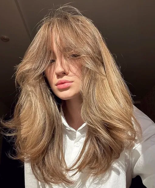 Длинные волосы в сочетании с мягкой челкой-«шторкой» — беспроигрышная классика. Такой образ смотрится очень женственно и визуально смягчает скулы и подбородок.
