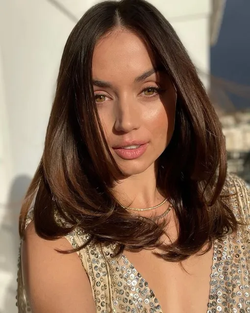 Если хочется оставить длину, смело выбирай мягкие длинные слои и трендовую челку-бабочку. Такая форма визуально вытягивает лицо и отвлекает внимание от квадратного подбородка. Стрижка подходит практически для всех типов волос и смотрится очень актуально.