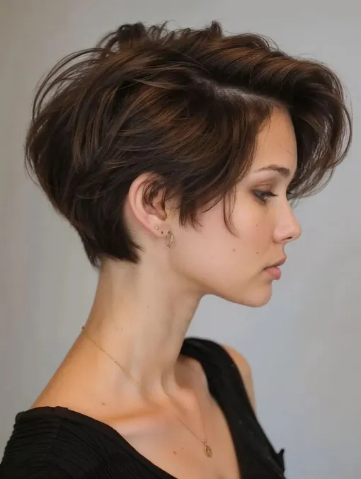 Короткий текстурированный пикси с «отросшими» висками и рваной челкой, уложенной отдельными прядками — это дерзкий вариант для самых смелых. Чтобы добавить легкости, волосы на шее должны смотреться чуть отросшими. Такая стрижка делает акцент на глазах и скулах и отводит взгляд от низа лица.