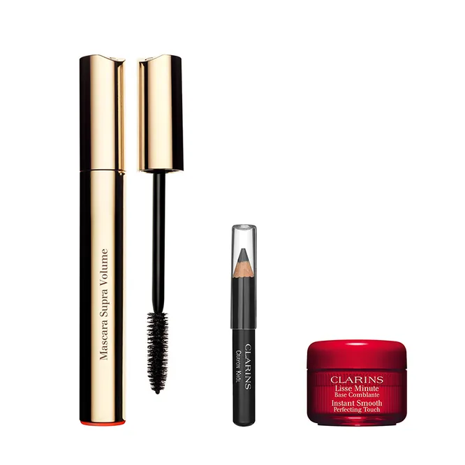 В косметическом наборе вся мейкап-база: праймер с тонирующим эффектом, палетка для глаз и лица, две помады, тушь и карандаш для глаз. Бонус — сияющая косметичка-клатч от бренда.
