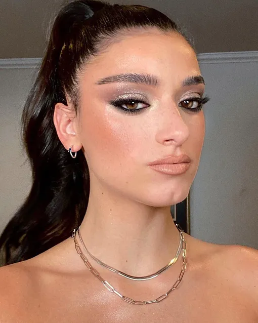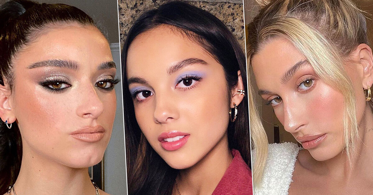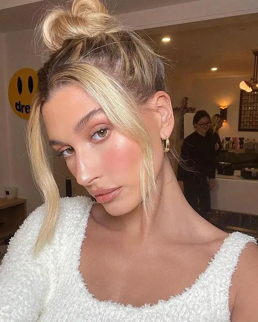 Классический макияж Хейли Бибер может стать твоим праздничным образом. Да, выглядит просто, но естественность — один из главных трендов 2021 года. Нанеси на верхнее и нижнее веко бежево-коричневый оттенок, на скулы — бронзер и персиковые румяна, а на губы — бежевую помаду.