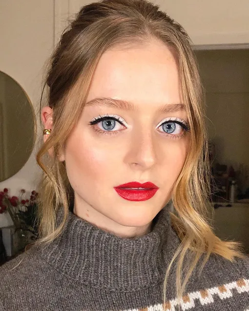 Нам кажется, что так красилась бы Белоснежка, если жила бы в 2020 году. Макияж очень простой, но всё равно по-своему праздничный: белые тени, тонкие черные стрелки и красная помада. Если у тебя нет времени краситься 31 декабря, то этот вариант — точно для тебя.