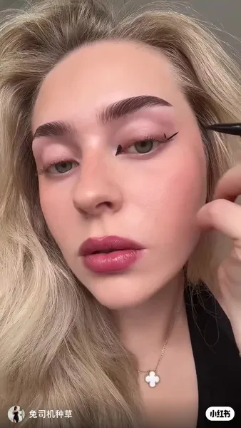 - Возьми черную подводку с тонким аппликатором. Проведи линию от середины века к виску, создавая классическую вытянутую стрелку. Затем добавь «клювик"— он должен быть острым и четким, направленным к носу.