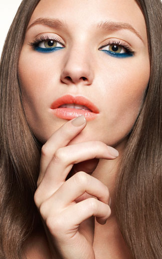 ![]() | «Если подвести синим цветом только нижние веки – макияж будет смотреться ярко и сексуально», — считает визажист Shiseido Татьяна Межуева. (1) Выровняй тон кожи при помощи крем-базы Pre Makeup Cream SPF15 от Shiseido и корректора. Прозрачная рассыпчатая пудра придаст лицу сияние. На скулах – светлые румяна теплого оттенка. (2) На верхнее веко, от внутреннего уголка глаза к внешнему, а также под бровь нанеси тени шелковистой текстуры с эффектом сияния (оттенок BE701). На нижнее веко влажным спонжем нанеси синие и зеленые тени (оттенок BL223 и GR222). Ресницы покрой черной тушью. (3) Для коррекции бровей используй специальный карандаш оттенка BR603 и прозрачный гель для фиксации формы. ГУБЫ: Наш выбор – светлая помада Perfect Rouge оттенка PK224 с эффектом мерцания. |