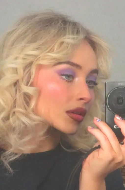 Если хочется сделать макияж более заметным, лиловый легко выдерживает насыщенность. У Сабрины Карпентер он работает как полноценный акцент: плотный цвет на подвижном веке, усиленный текстурой и поддержанный румянами.