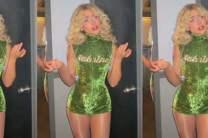 Если хочется сделать макияж более заметным, лиловый легко выдерживает насыщенность. У Сабрины Карпентер он работает как полноценный акцент: плотный цвет на подвижном веке, усиленный текстурой и поддержанный румянами.