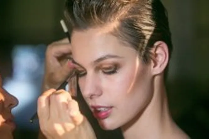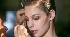 В основу положена светящаяся кожа, сияние на веках и на скулах. Этого эффекта визажисты добились с помощью базы Clarins Eclat Minute Embellisseur Teint (тон 00), румян Blush Prodige (01, Lovely Rose), перламутровых монотеней Clarins Ombre Minerale (оттенки 13, Dark Chocolate; 15, Black Sparkle; 01, White Sparkle) и кремово-бежевого хайлайтера, который присутствует во всех 4-х цветных палетках Clarins Eye Quartet Mineral Palette.